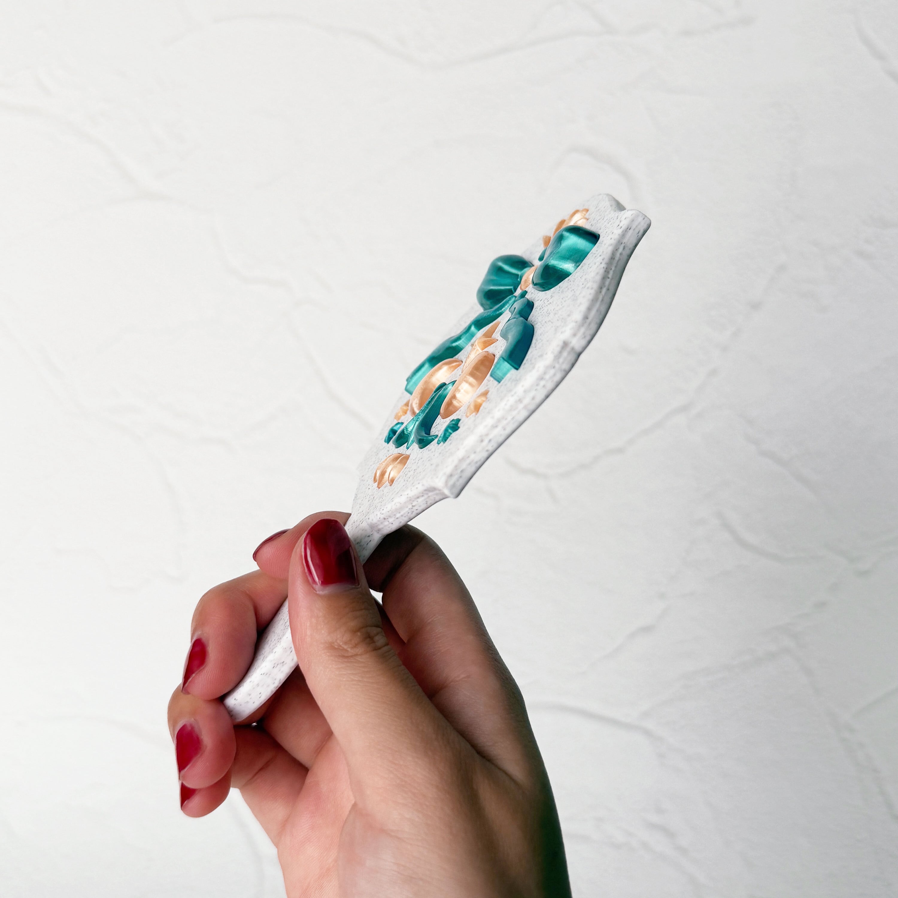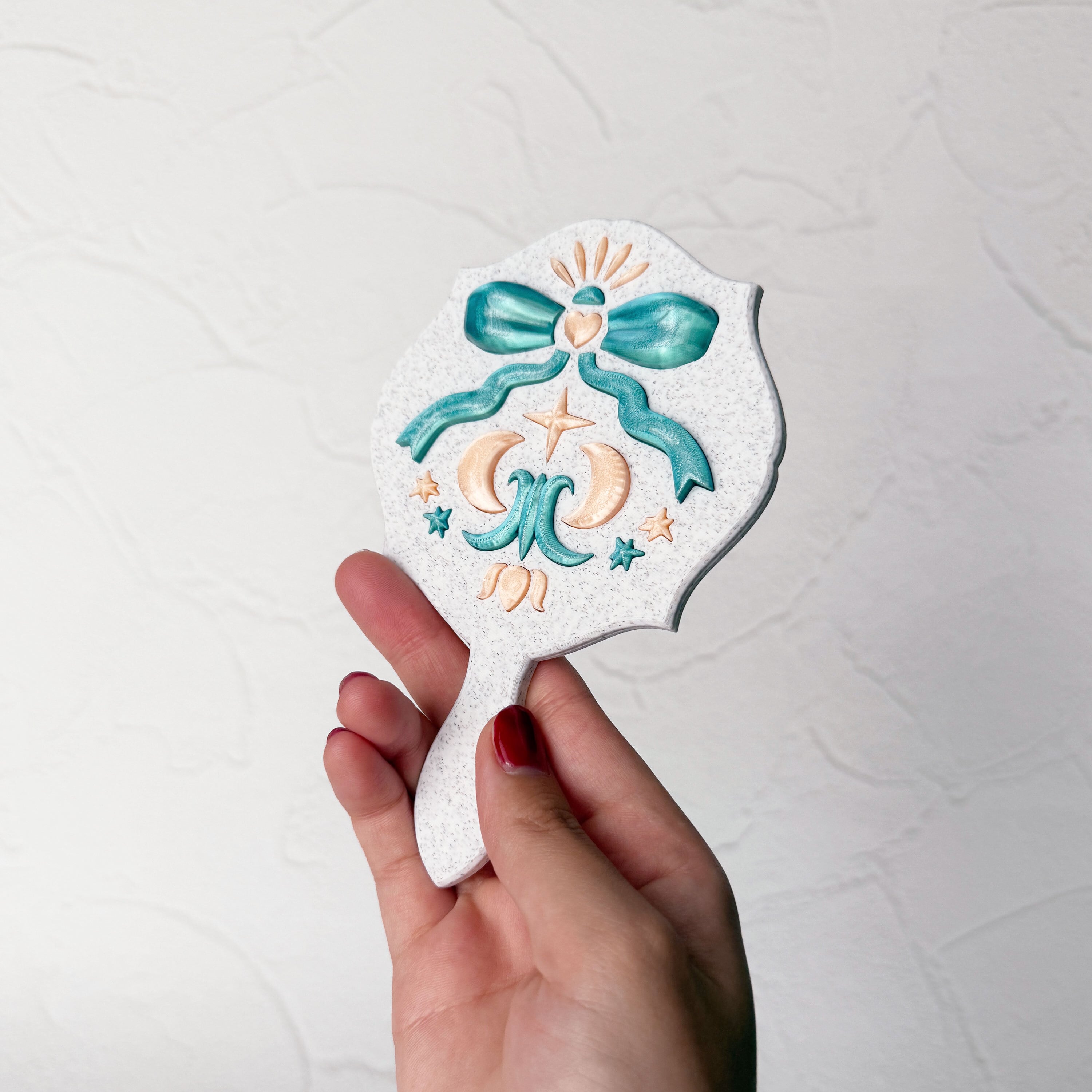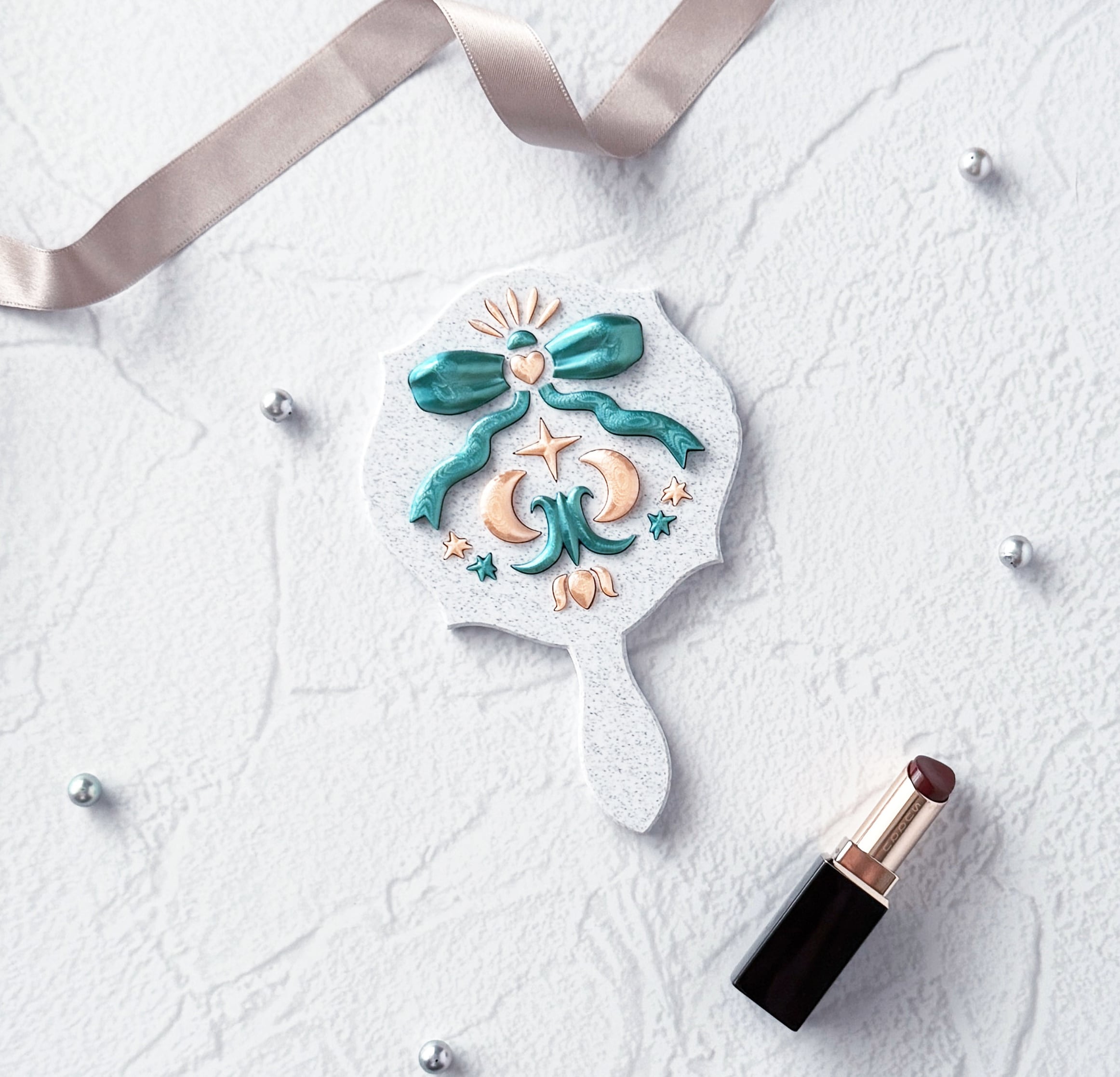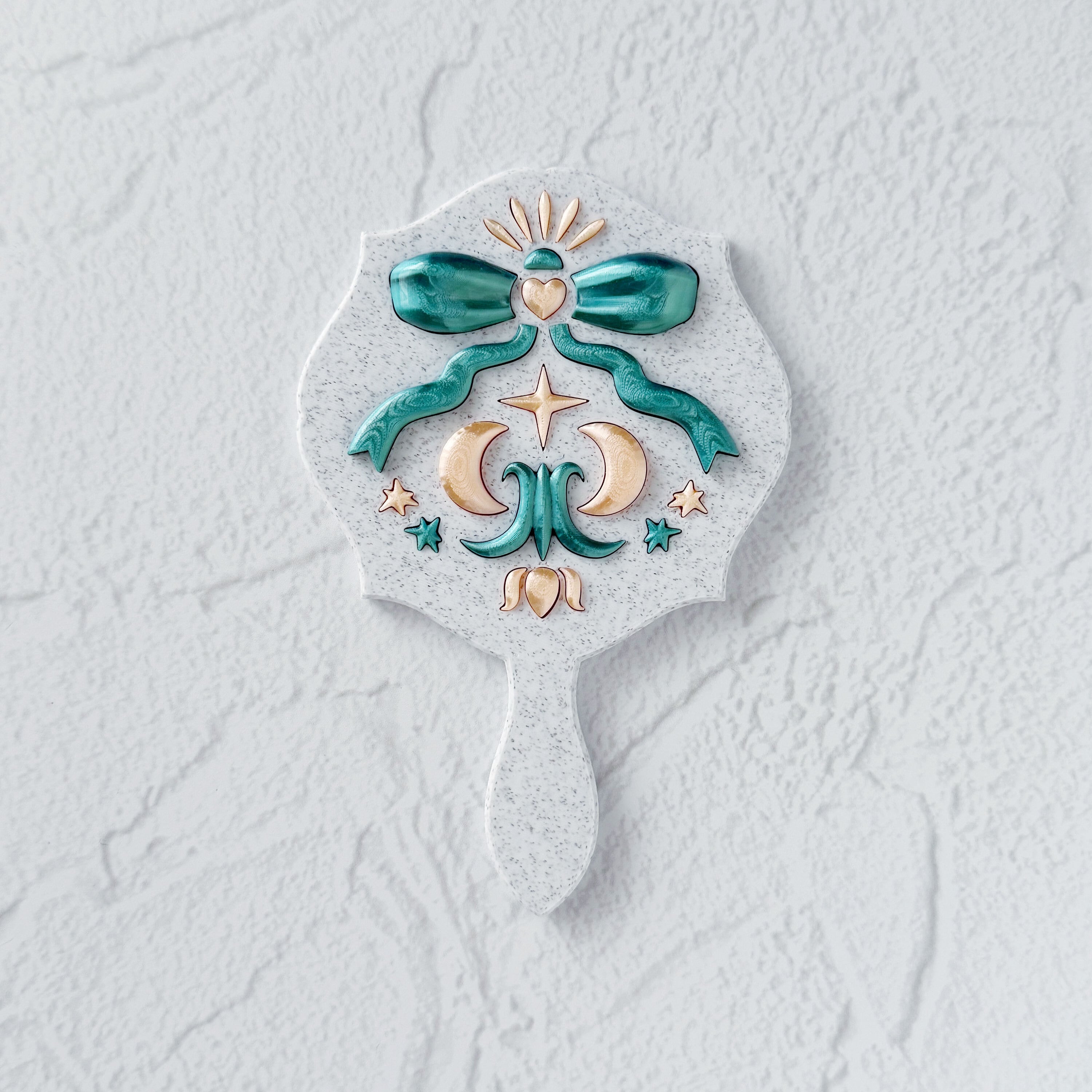 The soft white base, accented with blue-green and champagne gold, exudes an elegant yet heart-fluttering presence. Whenever you look into this mirror, you’ll feel a radiance as if you’ve draped yourself in starlight.